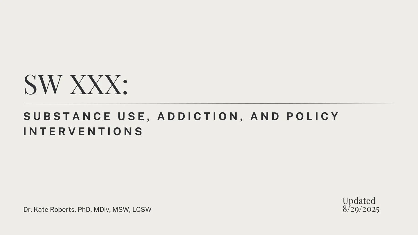This slide deck introduces students to the course framework, weaving together models of addiction, social work ethics, and policy contexts. Aligned with the syllabus, it balances core content, assigned readings, and interactive reflections to prepare MSW students to connect clinical practice with systemic and policy-level forces.